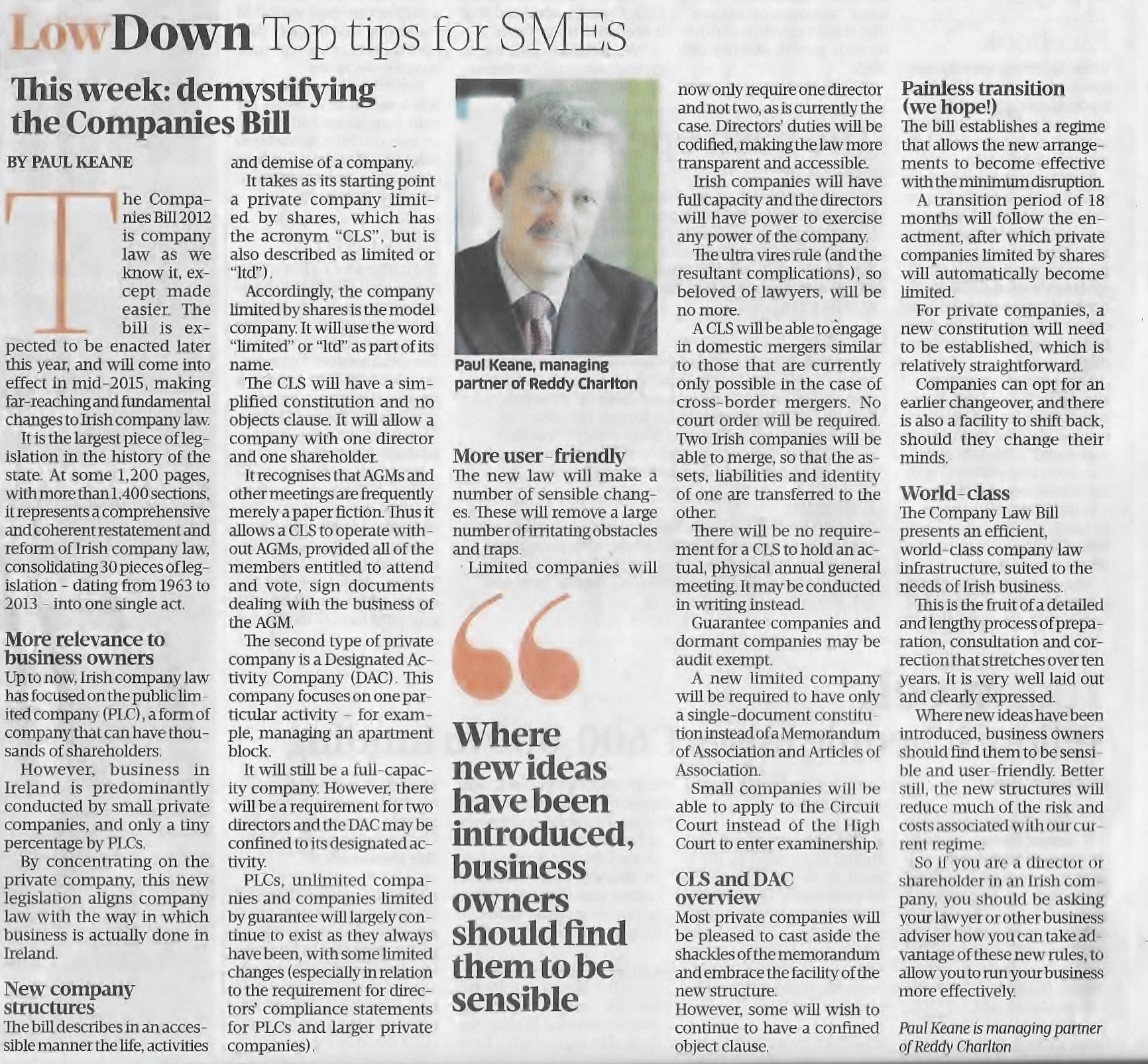 The Companies Bill 2012 is Company Law as we know it, but made easier. The Bill, which becomes effective in mid- 2015, makes far-reaching and fundamental changes to Irish company law. Paul Keane, Managing Partner, Reddy Charlton explains the key legislative changes and what business owners and directors need to know.